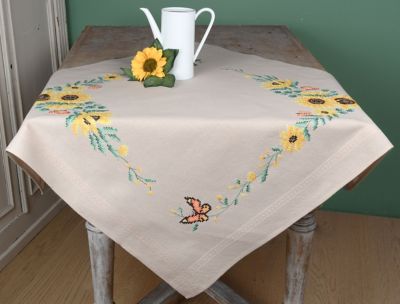 Nappe "tournesols", à broder au point de croix, au point lancé et au point de tige. Motif préimprimé, avec lisière, ourlée et prêt à l'emploi. Kit complet : notice, fil, aiguille à broder. Couleur du tissu : beige. Dimensions : 80 x 80 cm. Composition : tissu et fil 100 % coton.