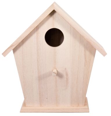 Nichoir en bois, à peindre et à décorer, couleur : naturel, ouverture : 3 cm Ø, dimensions : 16 x 8 x 17,5 cm. Non décoré.