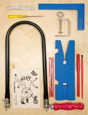 Lot d'outils de chantournage, 10 pièces. Contenu : scie à chantourner, règle, stylo, pinceau, tournevis, planche à scie avec support et serre-joint, lames de scie à chantourner et motif en bois.
