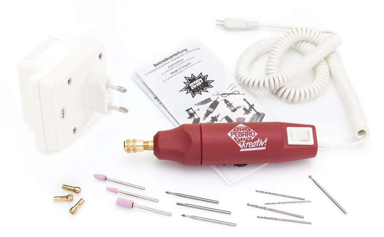 Perceuse électrique de Pebaro pour tous les fans de bricolage. Contenu : 1 perceuse électrique avec roulement à billes, 1 boîte d'alimentation 220 V, 4 pinces de serrage et 10 accessoires pour percer, fraiser, etc. Avec une prise européenne et le nombre de tours réglable. Perce des matériaux comme du bois, du verre, du plastique, etc. Puissance : 45 W.