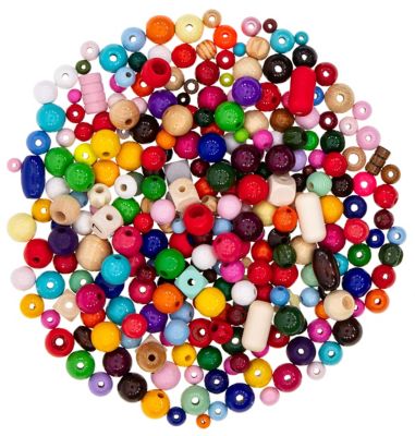 Perles en bois, multicolore, perles assorties, de formes et dimensions différentes, dim. perles : jusqu'à env. 1 cm Ø, trous percés : env. 1,5–3 mm. Contenu : 100 g = env. 200–400 pièces (selon disponibilité).