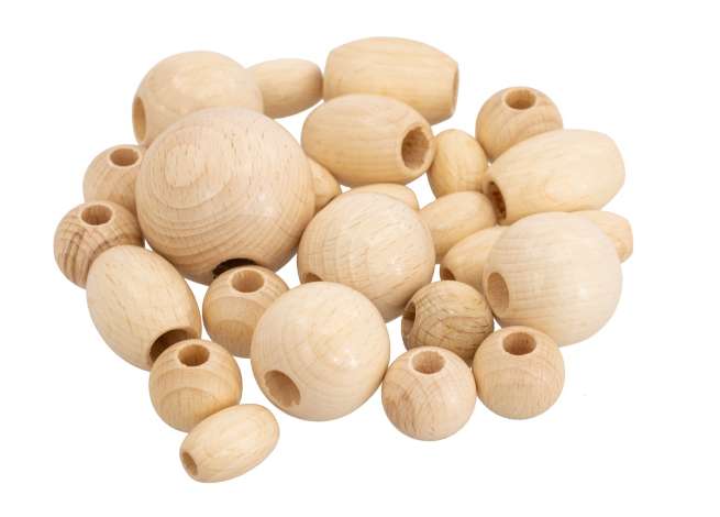 Perles en bois pour macramé, avec grandes perforations pour enfiler facilement les cordons de macramé, dimensions : 14-40 mm, diamètre perforations : env. 6-10 mm, couleur : naturel, contenu : 25 perles de formes et dimensions différentes.