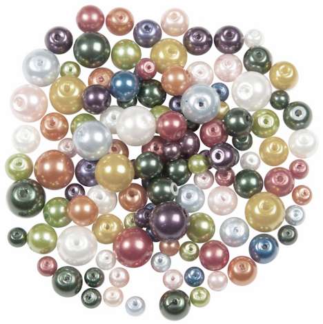 Perles nacrées en verre, de très bonne qualité, 7 couches de cire sur un noyau en verre, couleur : multicolore, dimensions: env. 4-8 mm Ø, contenu: 100 g = env. 400 pièces.