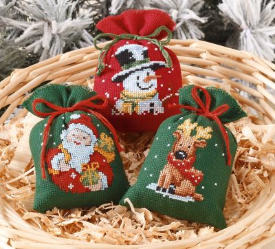 Petits sachets à broder "Noël approche", lot de pochettes (Père Noël, bonhomme de neige, rennes), à broder au point de croix, semi-confectionné. Kit complet : notice explicative, diagramme, fils et aiguille. Couleur tissu : vert/rouge, dim. : 8 x 12 cm. Composition : tissu Aïda et fils en 100 % coton (env. 7 points/cm).