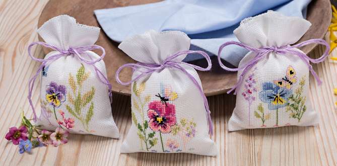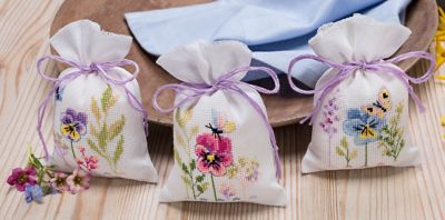 Petits sachets à broder "pensées", lot de 3. À broder selon la grille au point de croix (env. 7 points/cm), semi-confectionné. Kit complet : notice explicative, grille, fils, aiguille à broder. Couleur du tissu : blanc. Dimensions : 8 x 12 cm. Composition : toile Aïda et fils 100 % coton.