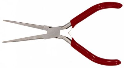 Pince plate et pointue, avec ressort et manche antidérapant, longueur : 14,5 cm, avec une largeur d'env. 2 mm et une épaisseur de 1 mm à l'avant.