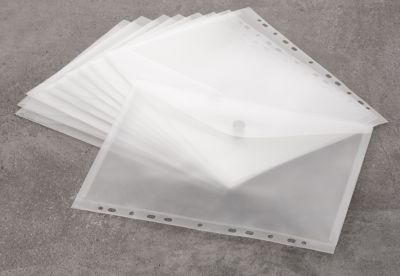 Pochettes à patrons, transparentes, format A4, très solide, avec fermeture velcro, format extérieur y compris marge de classement : 31 x 23,5 cm, contenu : 10 pochettes. Composition : polypropylène.