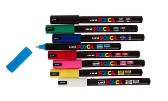 Découvrez les marqueurs polyvalents de POSCA. Ils conviennent au papier, au bois, à l’argile, au plastique, au métal, aux textiles et à de nombreuses autres surfaces. Les marqueurs sont aquarellables, ce qui permet de créer de superbes dégradés de couleurs ; les différentes teintes peuvent être mélangées entre elles directement sur la surface de peinture et, une fois sèches, être repeintes facilement. Les textiles peints sont lavables après fixation au fer à repasser ; sur la porcelaine et le verre, les marqueurs peuvent être cuits au four.