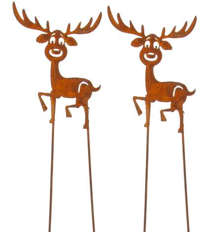 Rennes en métal aspect rouille, avec deux tiges chacun, couleur : marron, dim. : 15 x 11 cm, longueur des tiges : 30 cm, contenu : 2 rennes.