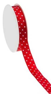 Ruban satin "pois", couleur : rouge/blanc, largeur : 15 mm, rouleau de 10 m. Composition : 100 % polyester.