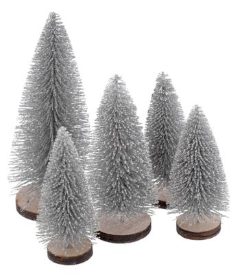 Sapins déco en plastique, pailletés, couleur : argenté, dimensions : 3x 9 cm, 1x 11,5 cm, 1x 14,5 cm, contenu : 5 pièces.