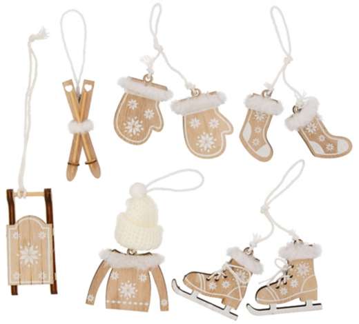 Suspensions "hiver" en bois, avec fausse fourrure blanche, couleur : écru naturel/blanc, dimensions : 13 x 11 x 2 cm, contenu : 6 pièces.
