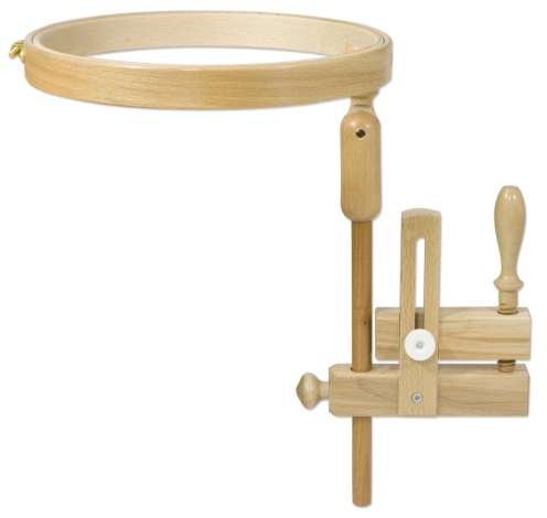 Tambour à broder avec fixation de table, facilite votre travail en vous libérant les 2 mains. Diamètre du tambour : env. 21,5 cm, épaisseur du tambour : env. 2,5 cm, hauteur totale de la fixation : env. 30 cm. Tambour en bois de hêtre, verni.