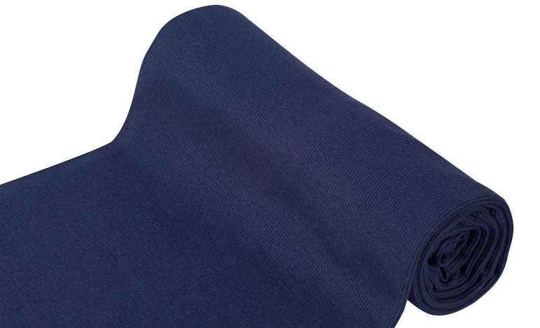 Tissu bord côte "Confort", bleu marine, en forme de tube, à côtes fines, très extensible et peu déformable grâce à l'élasthanne, idéal pour des bord côtes à des pulls, pantalons, vêtements de loisirs, etc. Le tissu est disponible en coupon de 0,5 m ou 1 m.