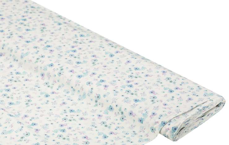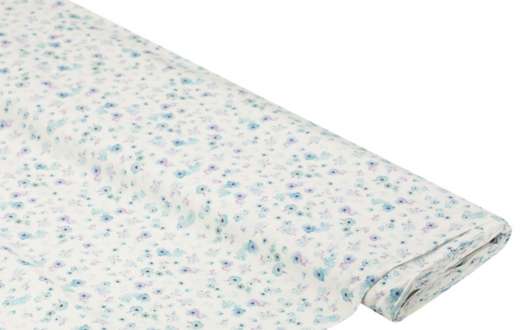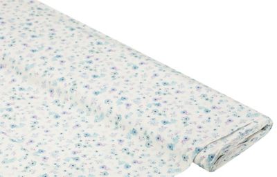 Tissu coton bio "petites fleurs", blanc délavé/bleu, dim. grande fleur : 1,5 x 2 cm.