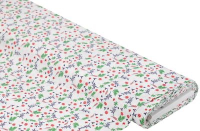 Exclusivité buttinette : Tissu coton « feuilles et cristaux », blanc/rouge/bleu, de la série « Mona », d'un coton particulièrement fin et doux, dim. grand cristal rouge : env. 1 cm Ø.