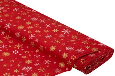 Exclusivité buttinette : Tissu coton « flocons de neige », rouge/doré, de la série « Mona », d'un coton particulièrement fin et doux, dim. petit cristal blanc : 1,4 cm Ø.
