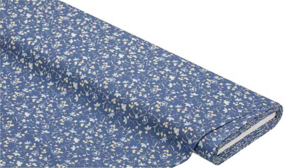Exclusivité buttinette : Tissu coton "maison de campagne", couleur : bleu foncé/écru naturel/bleu clair, de la série "Mona", d'un coton particulièrement fin, doux et très raffiné (renforcé), dimensions fleur à trois pétales : 1,5 x 1 cm, largeur du tissu : 150 cm, poids : env. 130 g/m². Composition : 100 % coton.