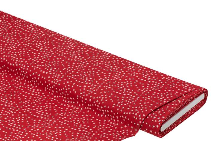 Exclusivité buttinette : Tissu coton "pluie d’étoiles", couleur : rouge/blanc, de la série "Sina", d'un coton particulièrement fin, doux et très raffiné (renforcé), dimensions étoiles : 4-7 mm Ø, largeur : 150 cm, poids : env. 130 g/m². Composition : 100 % coton.