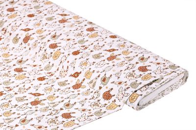 Exclusivité buttinette : Tissu coton "poules rigolotes", couleur : blanc/coloré, de la série "Lena", d'un coton particulièrement fin, doux et très raffiné (renforcé), dimensions poules : 3-4,5 cm, largeur : 150 cm, poids : env. 130 g/m². Composition : 100 % coton.