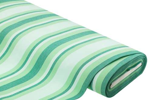 Tissu d'extérieur "Madrid" à rayures, couleur : vert/coloré, rayures verticales, enduit de téflon, hydrofuge, résistance à la lumière : très bonne, largeur : 160 cm, poids : env. 240 g/m². Composition : 80 % polyacrylique, 20 % polyester.