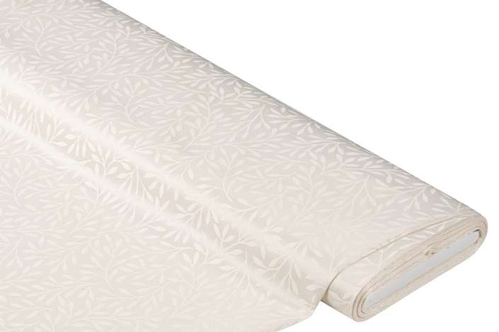 Tissu damassé « feuilles », anti-taches, crème, dim. feuilles : 15 x 5 mm.