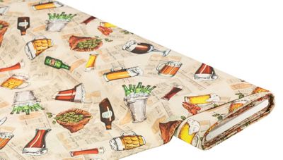 Tissu de décoration "bière et autres", couleur : écru naturel/coloré, dimensions verre à bière : 10,5 x 4,5 cm, largeur : 140 cm, poids : env. 170 g/m². Composition : 50 % coton, 50 % polyester.