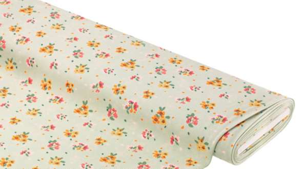 Tissu jersey de coton gaufré "fleurs" avec élasthanne, couleur : menthe/coloré, bi-élastique, dimensions trio de fleur jaune : 3,5 x 3 cm, largeur : 145 cm, poids : env. 225 g/m². Composition : 95 % coton, 5 % élasthanne.