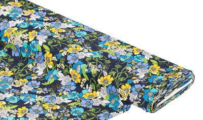 Tissu jersey en viscose « fleurs estivales », bleu/multicolore, bi-extensible.