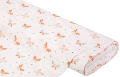 Tissu mousseline/double gaze "papillons", couleur : écru/coloré, dimension papillons : 4 x 4 cm, largeur : 130 cm, poids : env. 120 g/m². Composition : 100 % coton.