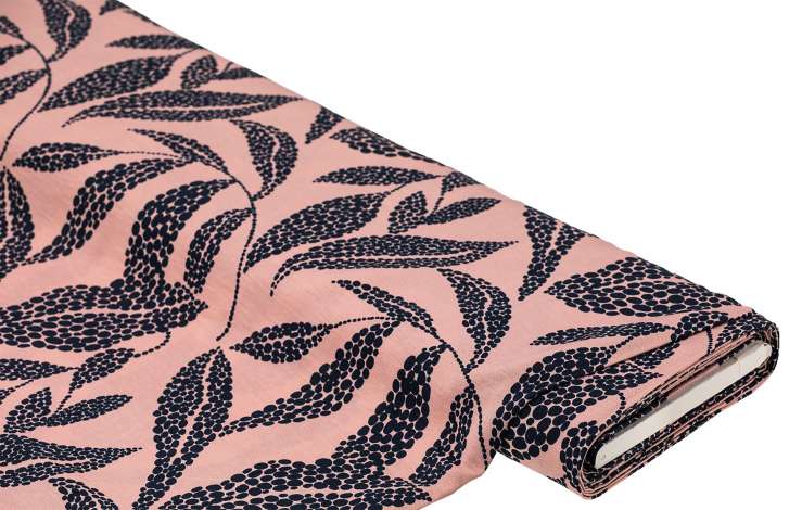 Tissu pour chemisiers/tissu froissé "feuilles", couleur : rose/coloré, largeur : 150 cm, poids : env. 135 g/m². Composition : 86 % viscose, 14 % polyamide.