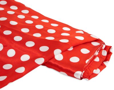 Tissu satin "pois", rouge/blanc, imprimé avec des pois, pour des déguisements (Rock 'n' Roll, amanite tue-mouches, etc.), dim. pois : 2,5 cm Ø.