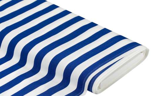 Tissu Toile transat / polyvalent à rayures, 44 cm de large, bleu/blanc, résistant à l'eau et aux intempéries, largeur de 44 cm adaptée pour les transats. Rayures verticales, largeur des rayures : 2–15 mm. Résistant à max. 100 kg.