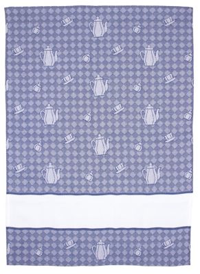 Torchon "théière". Déjà cousu, avec un motif jacquard tissé "théière" et une bordure Aïda à broder selon vos envies (environ 5 points/cm). Couleur : bleu/blanc. Dimensions : 50 x 70 cm, bordure Aïda : largeur 9 cm. Composition : 100 % coton.